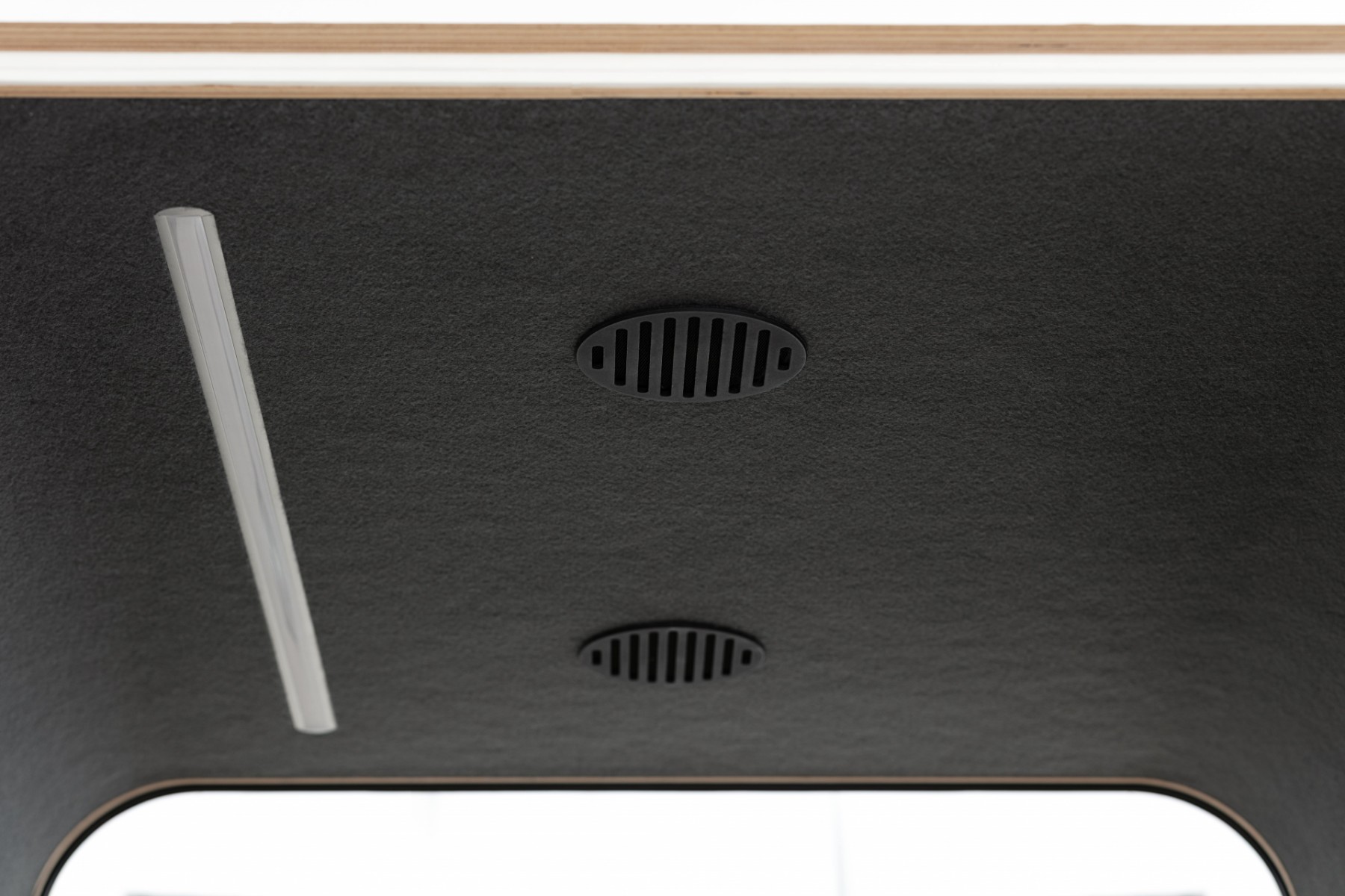 Let the booth help clear your mind. The sophisticated ventilation system is automatically switched on by a sensor after users enter the booth, and switched off after exiting. The ventilation technology is fully soundproof as fresh air flows into the booth.